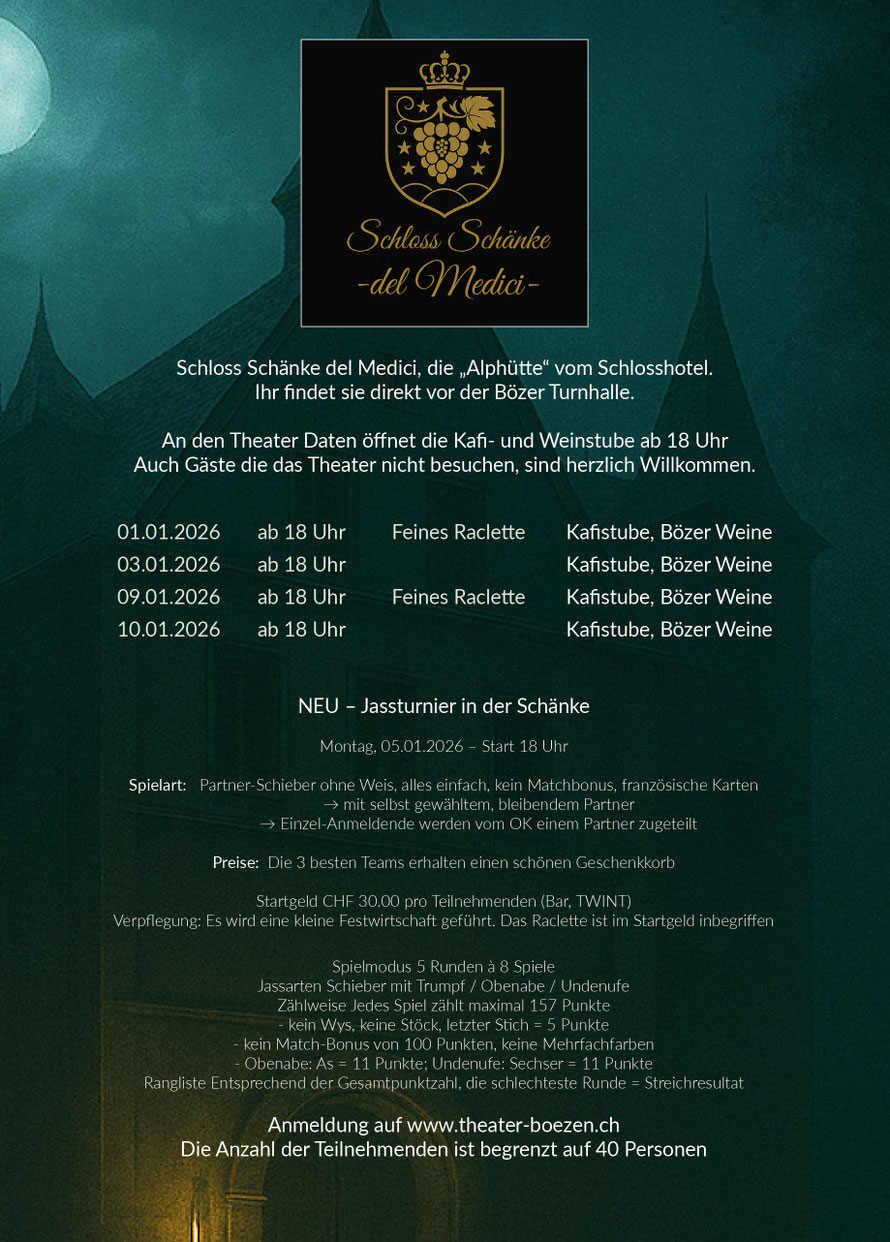 Wir freuen uns ausserordentlich Sie dieses Jahr, passend zum Stück, in einer gemütlichen Alphütte